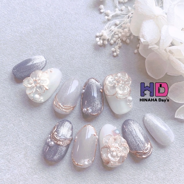 《専用ケース付♡》ネイルチップ ブライダル ウェディング オーダー 3Dフラワー 花 白 ホワイトゴールド ブーケ 大人可愛い
