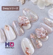 くすみカラーの3dリボンとクリアな3dフラワーを合わせた大人可愛いデザイン♡画像では少しわかりづらいですが、3dフラワーの花弁にも、オーロラを挟んでいます✨