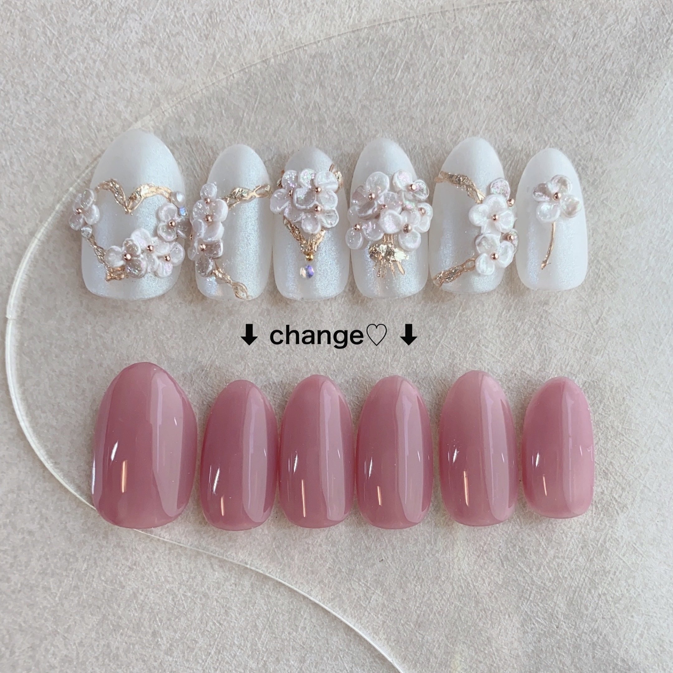 ウェディングらしく、ブーケやアクセサリー・花冠などをモチーフに、ホワイト系の3Dフラワーをいっぱい咲かせた可愛いらしいデザイン♡
