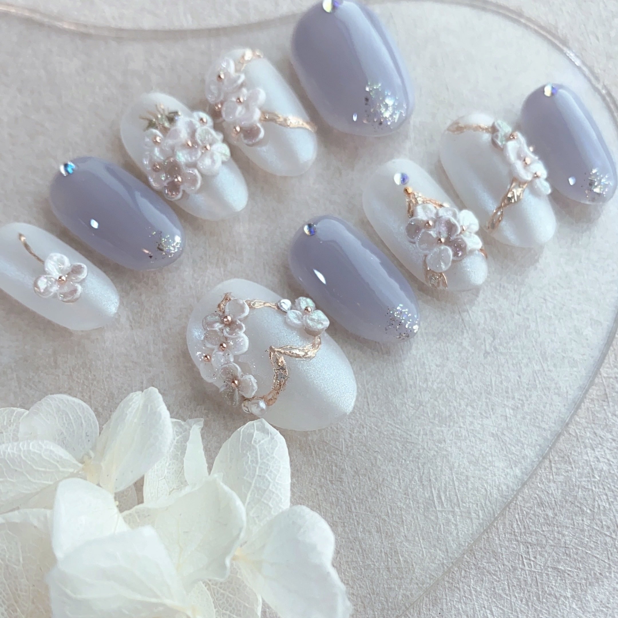 ウェディングらしく、ブーケやアクセサリー・花冠などをモチーフに、ホワイト系の3Dフラワーをいっぱい咲かせた可愛いらしいデザイン♡