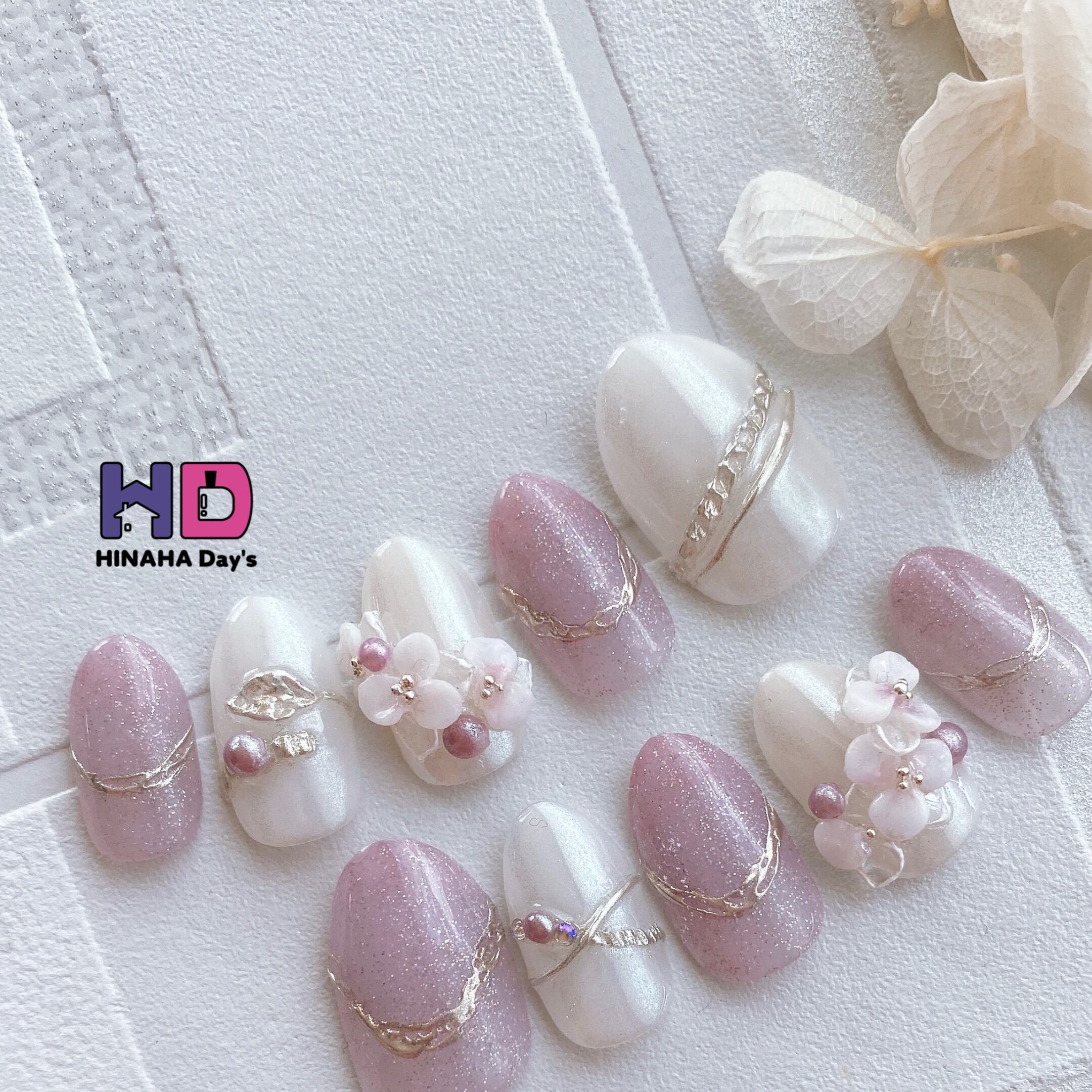 《専用ケース付♡》ネイルチップ ブライダル ウェディング オーダー ニュアンス 3D 花 白 ホワイト シアーピンク パール リングネイル 上品華やか